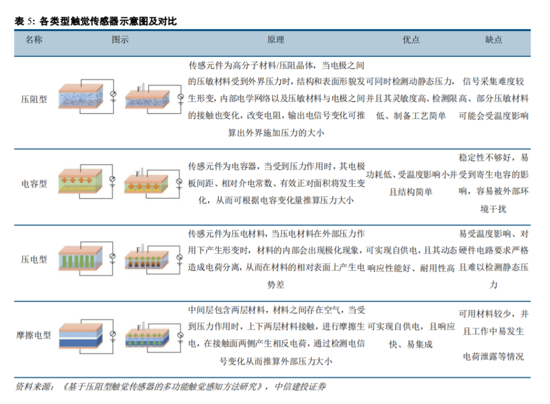 目前技术尚未定型,多条技术路线并行发展,按照原理分为压电式、压阻式、电容式等;按照结构和材料不同分为力矩传感器、柔性传感器和mems压力传感器等。