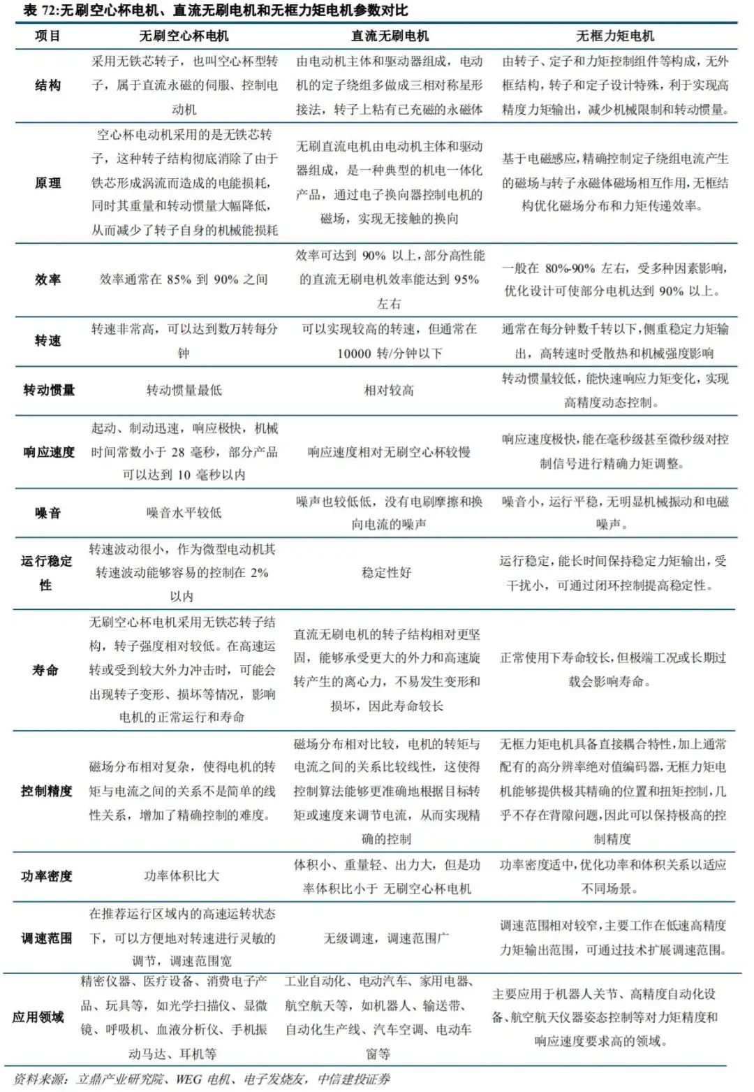 空心杯电机响应快、效率高;直流无刷电机控制精度较高、寿命较长;无框力矩电机拥有精度和紧凑度优势,但是小尺寸生产难度大