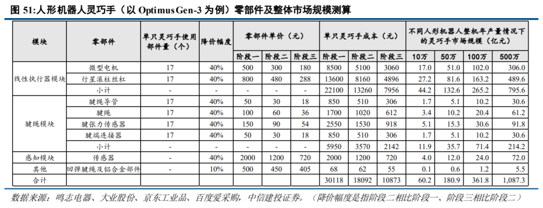 2.OptimusGen-3灵巧手预计拥有22个自由度,将使用17个线性执行器模块和腱绳模块。根据我们测算,随着特斯拉推动人形机器人及灵巧手产业链成本下降,未来供应商的单价和利润率虽然会呈现下行趋势。