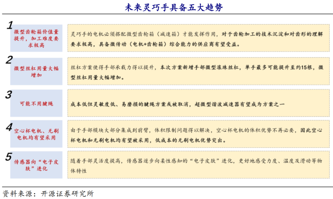 5.灵巧手未来在柔性感知、紧凑化和精密化、深度仿生、创新型方案设计方面有望继续优化发展。