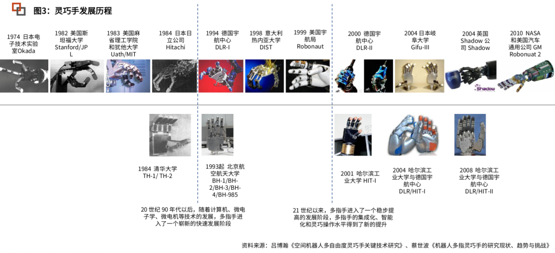 自20世纪70年代以来,多指灵巧手主要经历了三个发展阶段,逐步向智能化、灵巧化、抓取精准化方向发展。