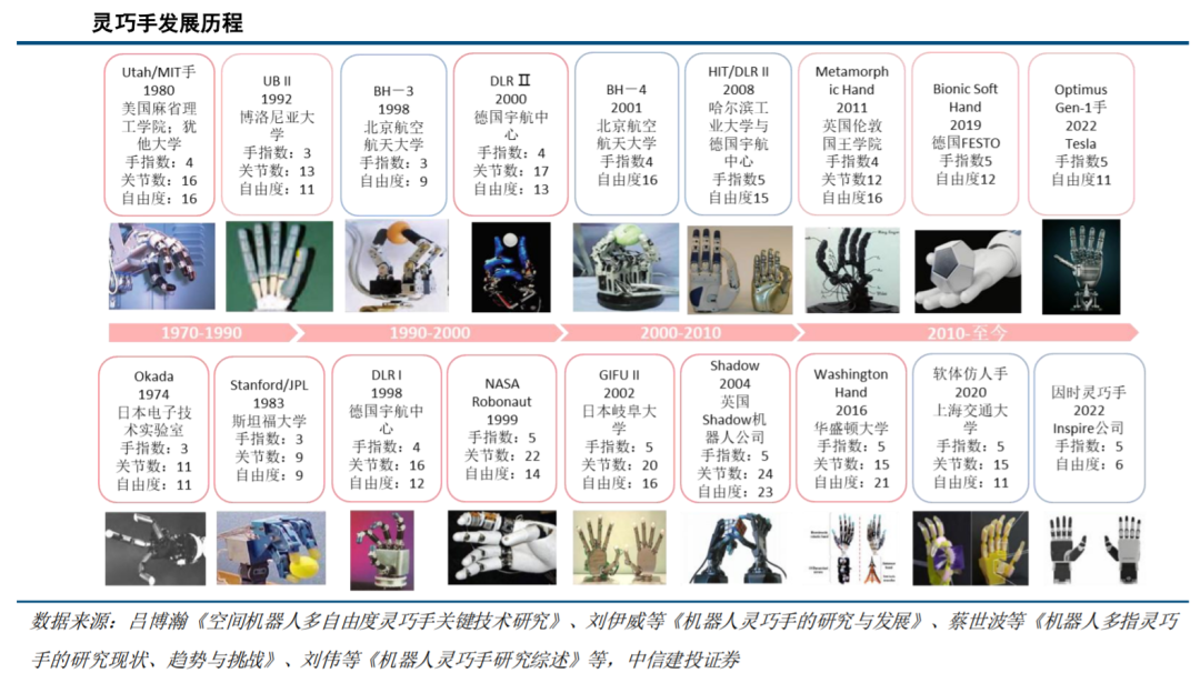 20世纪70年代后以多自由度、多感知、可控制为标志的现代灵巧手产生。