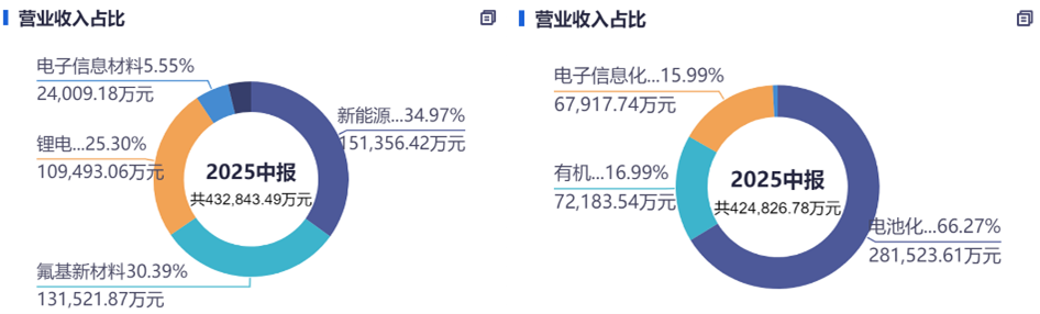 多氟多本质上是一家上游材料制造商。它从萤石出发,自产氢氟酸、氟化锂,再合成六氟磷酸锂、LiFSI(双氟磺酰亚胺锂)等锂电盐,甚至向下延伸至大圆柱电池。2025年半年报显示,公司新能源材料、氟基新材料、电子信息材料占营收比分别为34.97%、30.39%、5.55%,合计超七成来自基础化学品和中间体。这种模式决定了它对原材料成本和产品价格高度敏感,一旦六氟磷酸锂跌破现金成本线,即便技术再强,也难逃亏损。
