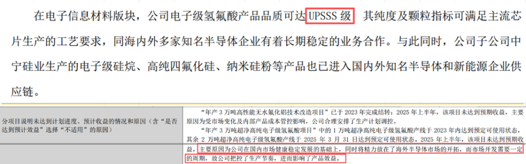 真正值得观察的是它的第二曲线——电子级氢氟酸,该产品达UP-SSS级,纯度与颗粒指标满足主流芯片制程要求,已获台积电、三星、中芯国际等认证,并与海内外多家半导体企业建立稳定合作。其年产3万吨项目已于2025年3月全部建成,但上半年效益未达预期,公司称其主动放慢生产节奏,聚焦海外客户开拓,但市场导入需周期,导致产能利用率偏低,毛利率目前仅5.65%。简单说,技术卡位已成,就看放量何时兑现。