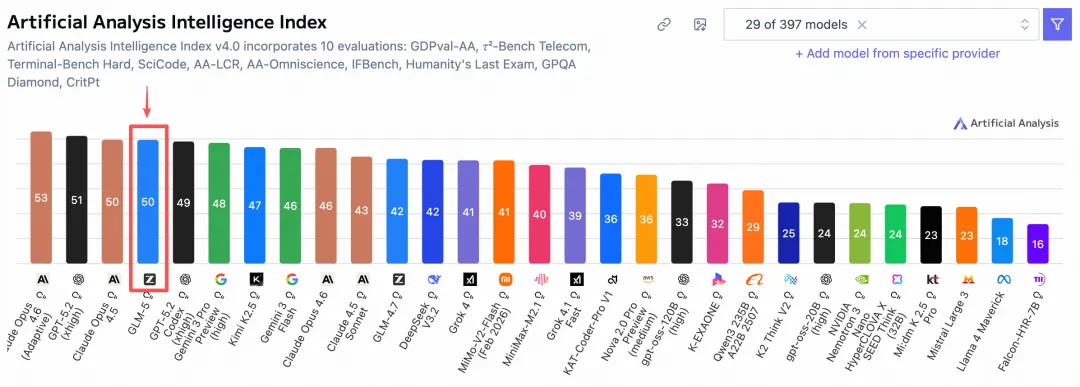 在 Coding 与 Agent 能力上,GLM-5 取得开源 SOTA 表现,在全球权威的 Artificial Analysis 榜单中, 位居全球第四、开源第一。