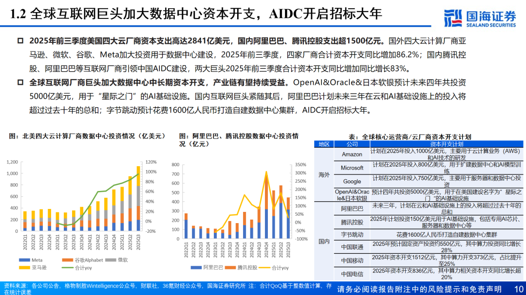 全球AIDC向大规模、高功率密度、高能耗三大趋势发展,SemiAnalysis预计2023-2028年全球AIDC新增装机CAGR高达40.4%。2025年前三季度美国四大云厂商资本支出高达2841亿美元,国内阿里巴巴、腾讯控股支出超1500亿元,2025年国内外云厂商计划进一步加大数据中心资本开支,2026年有望维持高位,AIDC上行趋势明晰。