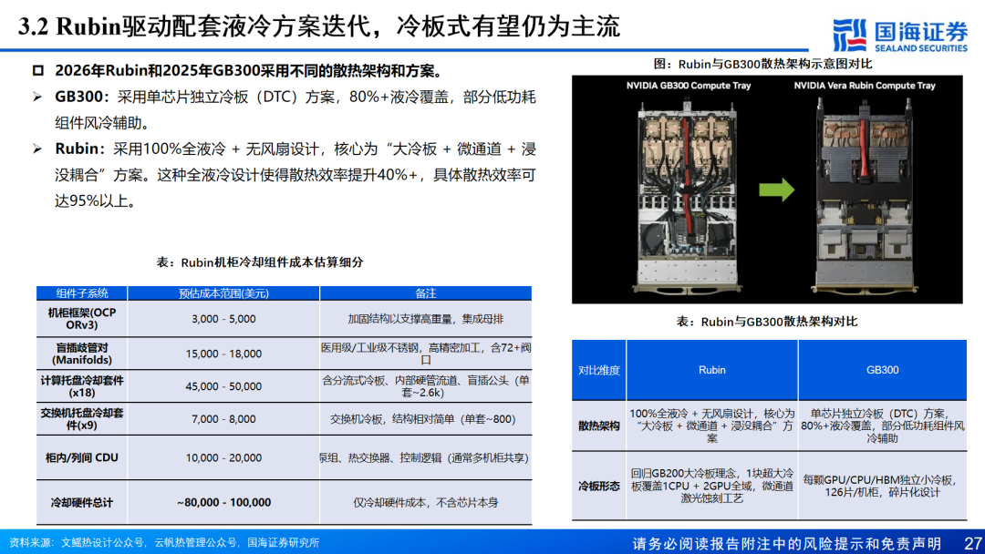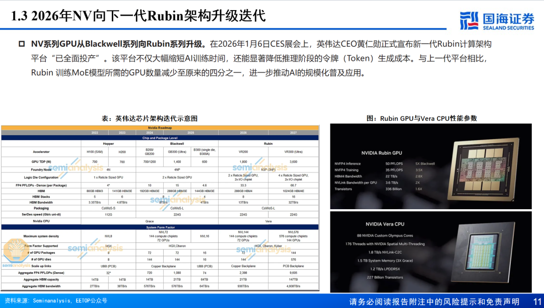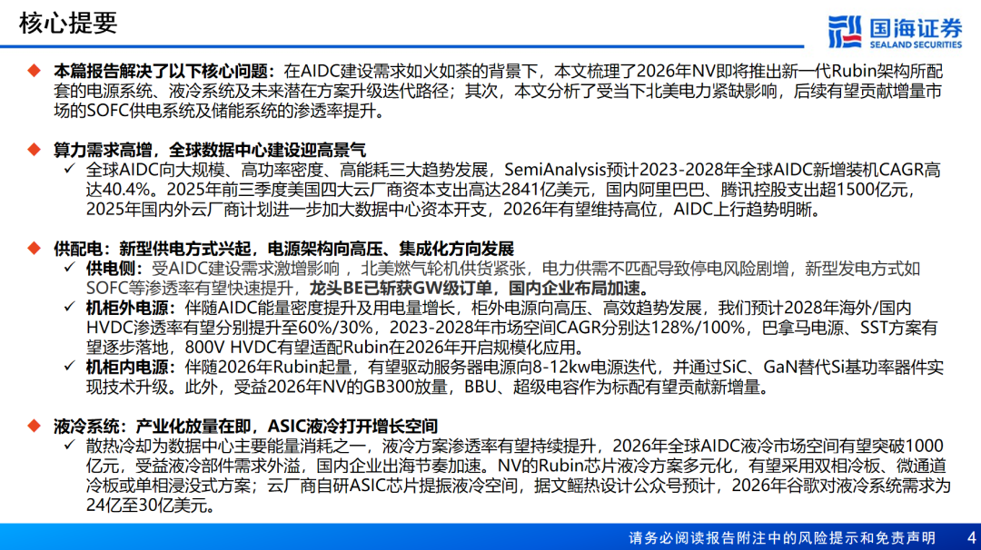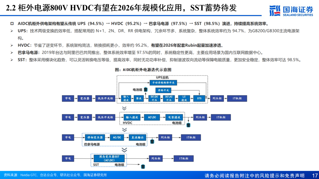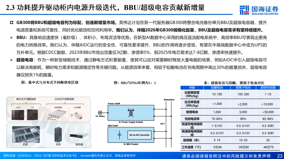 机柜内电源:伴随2026年Rubin起量,有望驱动服务器电源向8-12kw电源迭代,并通过SiC、GaN替代Si基功率器件实现技术升级。此外,受益2026年NV的GB300放量,BBU、超级电容作为标配有望贡献新增。