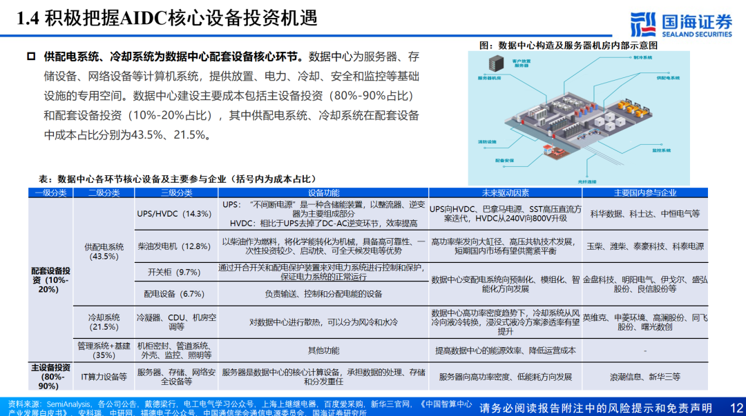 电源系统:AIDC向高功耗方向发展,驱动机柜外电源向高压直流切换,同时提升机柜内电源竞争技术壁垒,伴随GB300放量,BBU及超级电容需求有望提升,建议关注【金盘科技】、【伊戈尔】、【良信股份】、【科士达】、【科华数据】、【盛弘股份】、【麦格米特】、【欧陆通】、【江海股份】等。