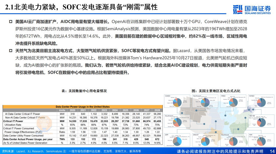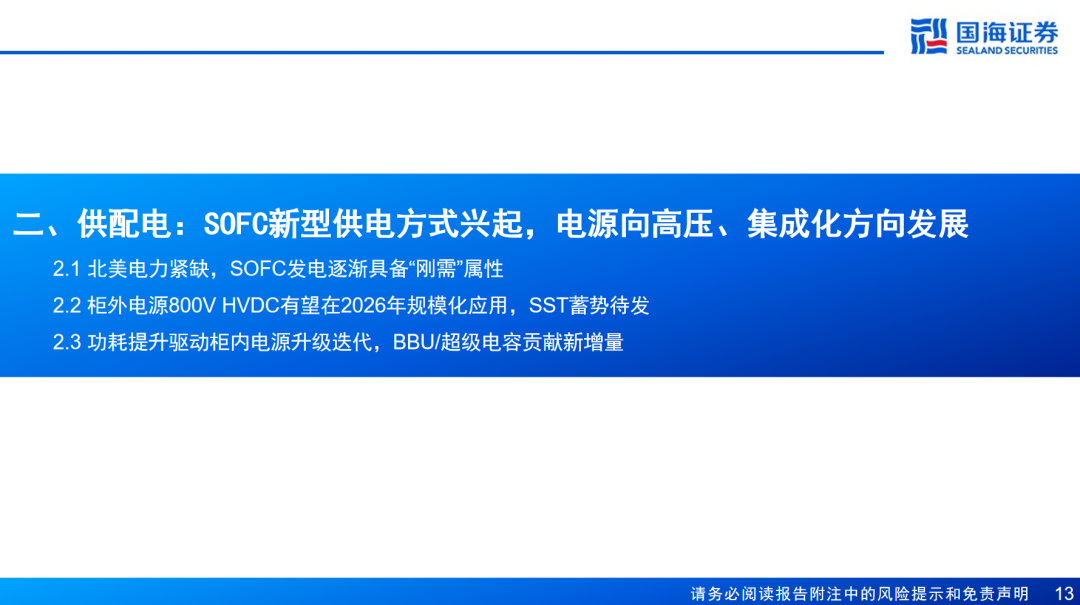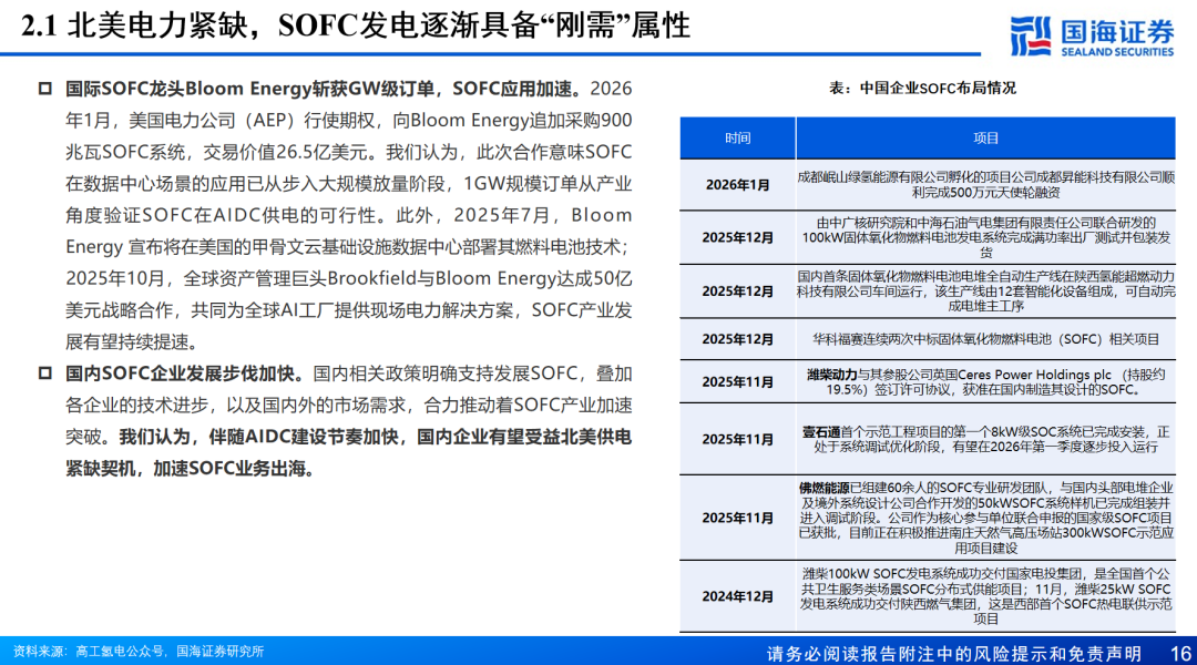 供电侧:受AIDC建设需求激增影响 ,北美燃气轮机供货紧张,电力供需不匹配导致停电风险剧增,新型发电方式如SOFC等渗透率有望快速提升,龙头BE已斩获GW级订单,国内企业布局加速。