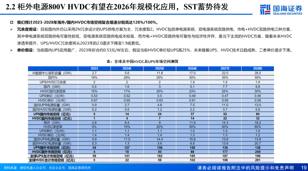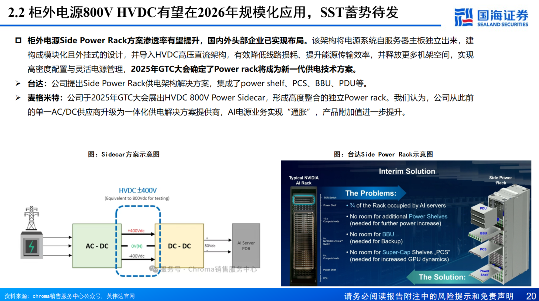 机柜外电源:伴随AIDC能量密度提升及用电量增长,柜外电源向高压、高效趋势发展,我们预计2028年海外/国内HVDC渗透率有望分别提升至60%/30%,2023-2028年市场空间CAGR分别达128%/100%,巴拿马电源、SST方案有望逐步落地,800V HVDC有望适配Rubin在2026年开启规模化应用。