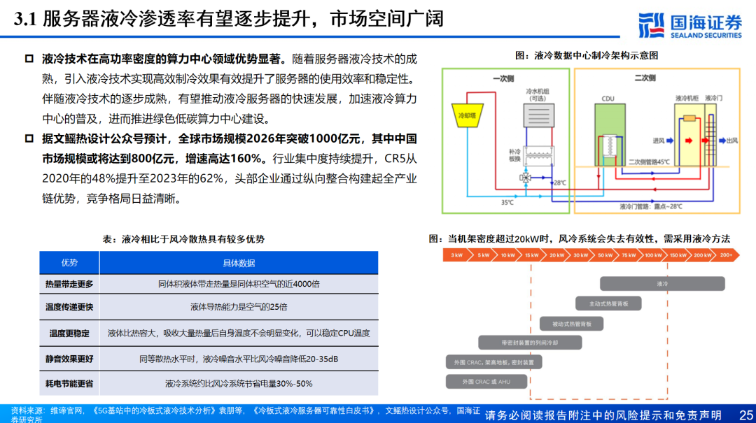液冷系统:机柜功率密度提升驱动AIDC冷却从风冷向液冷渗透,冷板式方案率先应用,浸没式方案静待花开,建议关注【英维克】、【申菱环境】、【高澜股份】、【同飞股份】、【科创新源】、【硕贝德】、【冰轮环境】等。