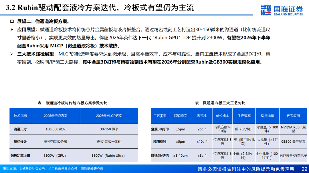 散热冷却为数据中心主要能量消耗之一,液冷方案渗透率有望持续提升,2026年全球AIDC液冷市场空间有望突破1000亿元,受益液冷部件需求外溢,国内企业出海节奏加速。NV的Rubin芯片液冷方案多元化,有望采用双相冷板、微通道冷板或单相浸没式方案;云厂商自研ASIC芯片提振液冷空间,据文鳐热设计公众号预计,2026年谷歌对液冷系统需求为24亿至30亿美元。