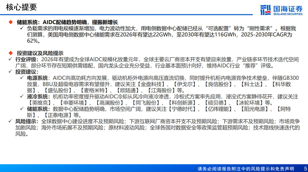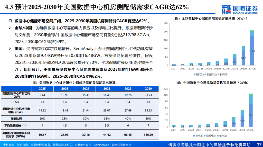 负载需求的用电规模逐渐增加,电力波动性加大,用电侧数据中心配储已经从“可选配置”转为“刚性需求”。根据我们测算,美国用电侧数据中心储能需求在2026年有望达22GWh,至2030年有望达116GWh,2025-2030年CAGR为62%。