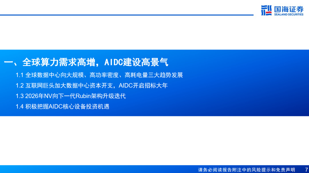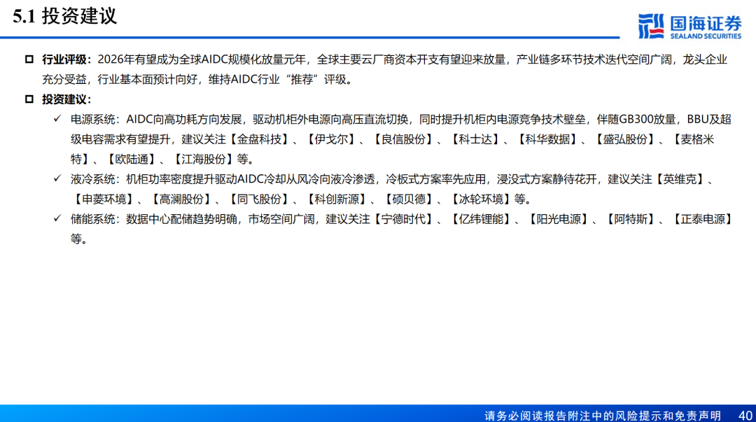 行业评级:2026年有望成为全球AIDC规模化放量元年,全球主要云厂商资本开支有望迎来放量,产业链多环节技术迭代空间广阔,部分环节存在短期供需错配,国内龙头企业充分受益,行业基本面预计向好,维持AIDC行业“推荐”评级。