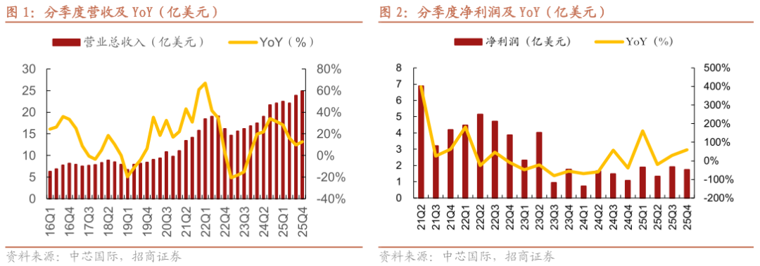 中芯国际发布25Q4季报,25Q4营收24.89亿美元创历史新高,同比 12.8%/环比 4.5%,超指引上限,系晶圆销量增加及产品组合优化;毛利率19.2%,同比-3.4pcts/环比-2.8pcts,毛利率下降系折旧增加。总产能为105.9万片/月,环比增长3.6万片;晶圆出货量(折合8英寸)为251.5万片,同比 26.3%/环比 0.6%;产能利用率为95.7%,环比-0.1pct;折合8英寸ASP为914美元/片,环比 1%。**“**”投资评级。
