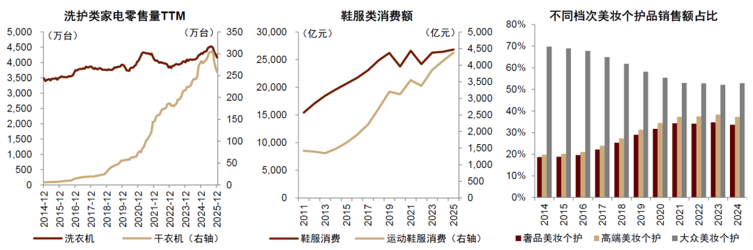 即使在那些大盘增长趋缓的消费领域,居民需求也在不断更迭,推动相关细分领域增长。例如洗护类家电、鞋服类消费、美妆个护消费,国内消费大盘增长都已明显放缓,但其细分消费分项有增有减,其中渗透率低、升级消费相关的细分品类保持了更好的增长。比如低渗透率的干衣机、偏升级类的运动鞋服和奢品美妆等消费,增长均比大盘更快(图表6)。