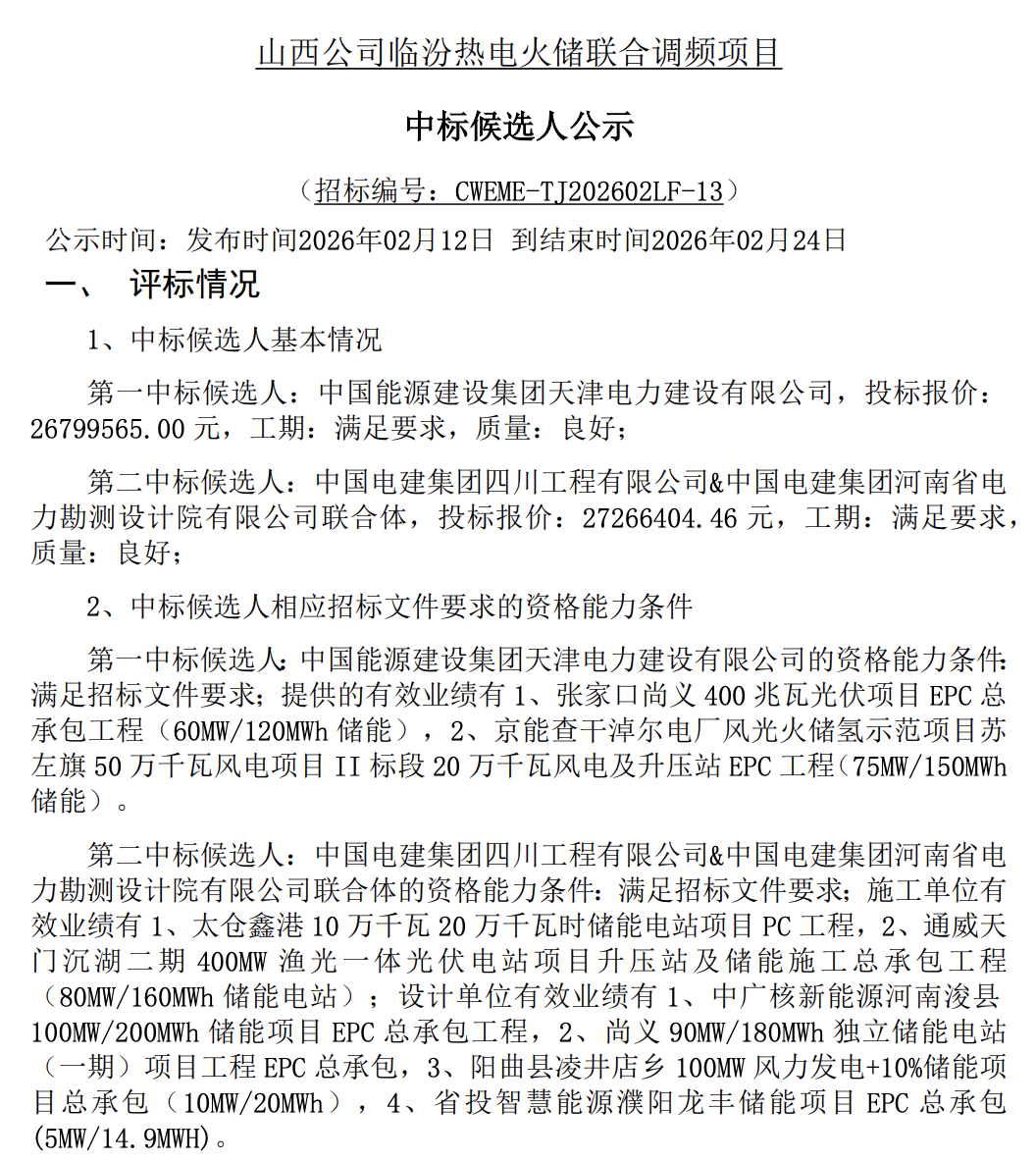 2月12日,山西公司临汾热电(600MW)火储联合调频项目(EPC)中标候选人公示。中国能建、中国电建竞标。