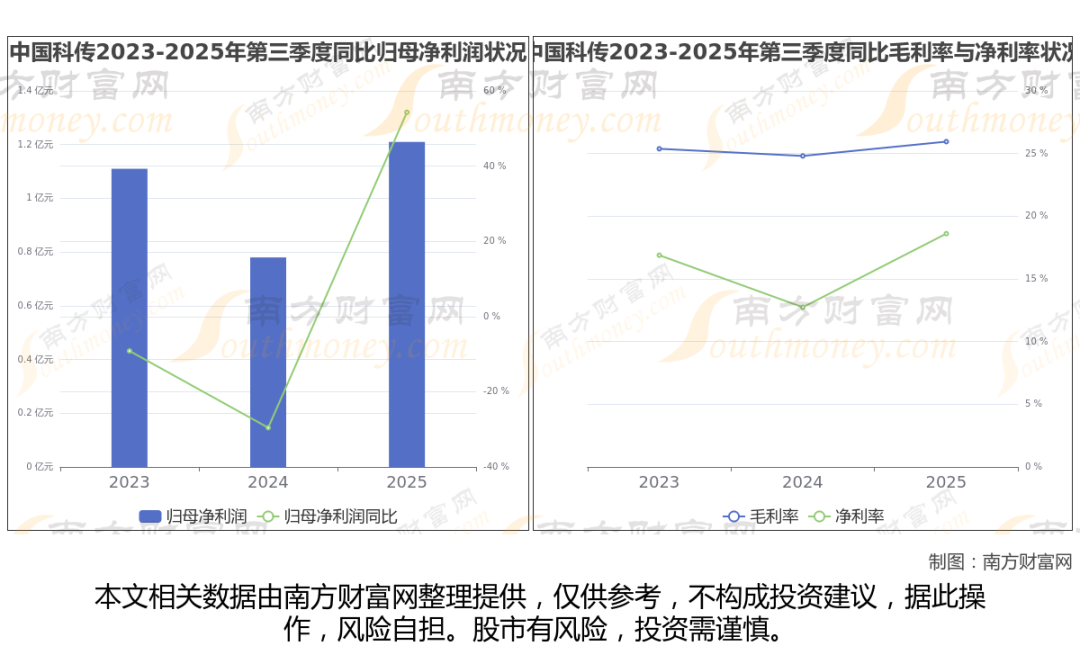 2025年第三季度季报显示,中国科传公司实现净利润1.21亿,同比上年增长率为54.31%,毛利率25.95%。