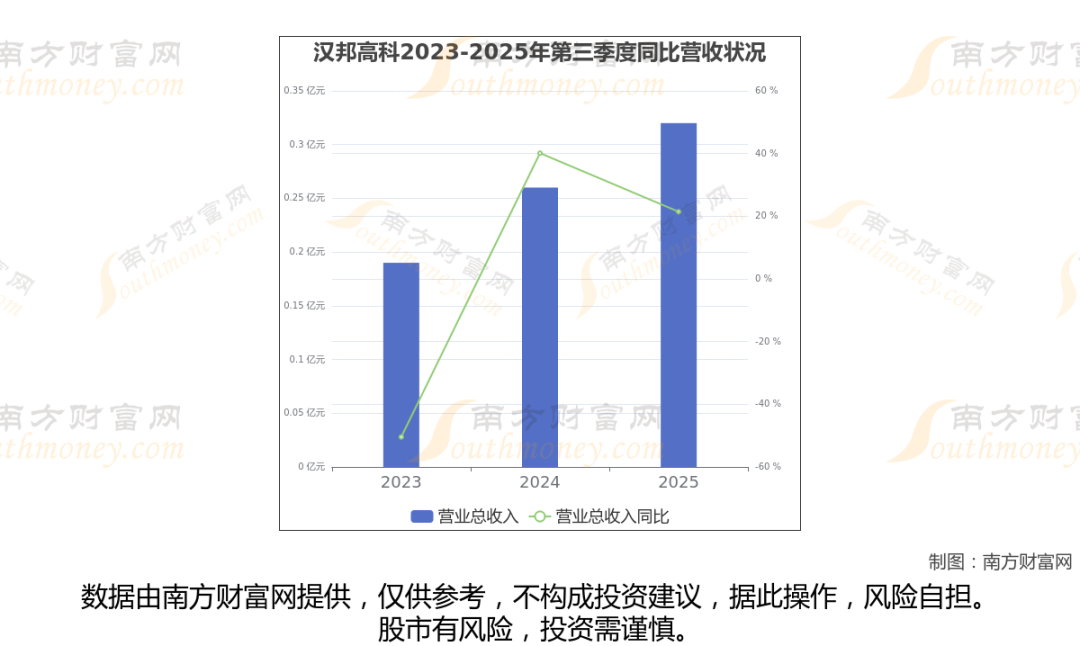 于2025年第三季度,汉邦高科披露了其业绩表现(如上图),其中主营业务收入3179.63万元,相较于去年同期21.43%。