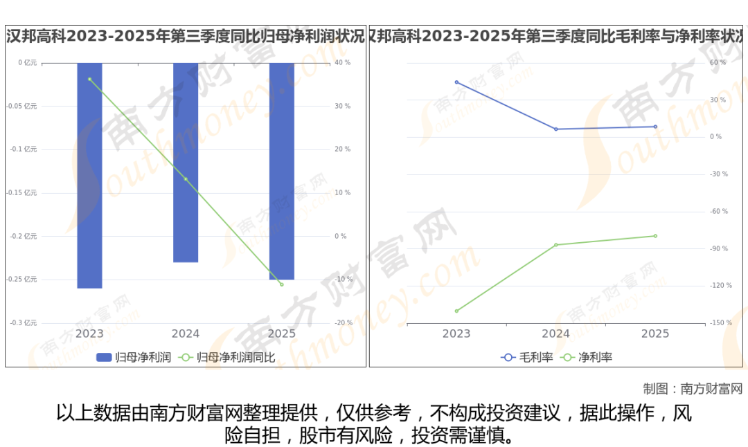2025年第三季度季报显示,汉邦高科公司实现净利润-2527.74万,同比增长-11.13%;毛利润为270.97万,毛利率8.52%。
