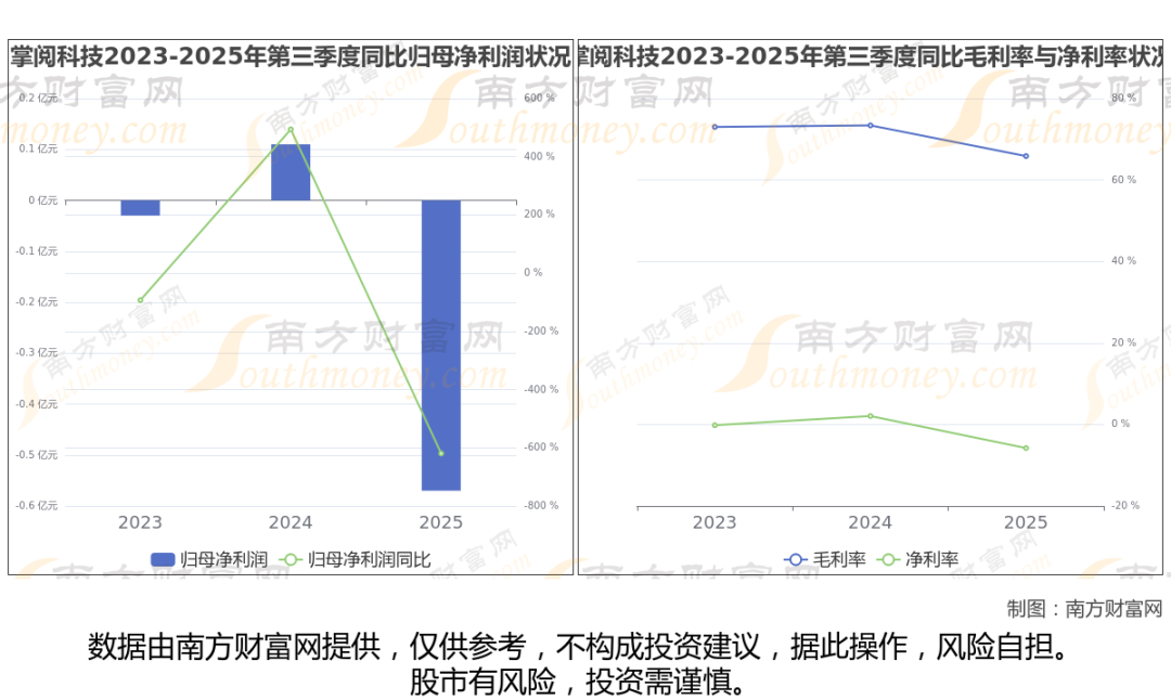 公司2025年第三季度季报显示,掌阅科技实现净利润-5651.72万,同比增长-619.61%;毛利润为6.16亿,毛利率65.86%。