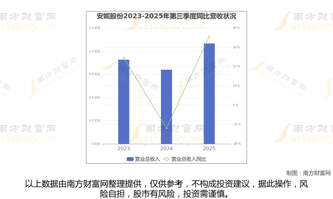 安妮股份披露了2025年第三季度财报。报告显示(如上图),安妮股份2025年第三季度实现营收1.3亿元,同比35.61%。