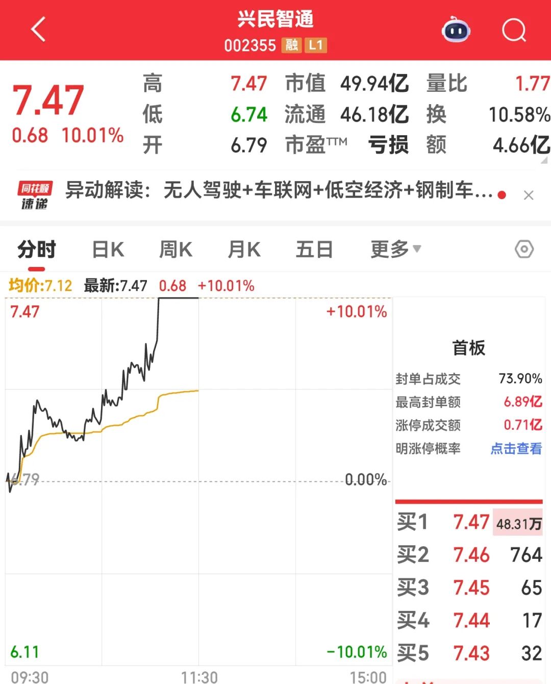 兴民智通(002355)早盘获48.31万手买单封板,封单资金达到3.61亿元,公司在投资者问答平台上表示,公司与北汽集团在自动驾驶领域围绕技术攻关、平台协同与场景创新展开:联合开发5G及车载卫星通信技术,攻关多域融合控制器平台,深化北斗高精度定位技术的应用,全方位支撑自动驾驶功能落地。