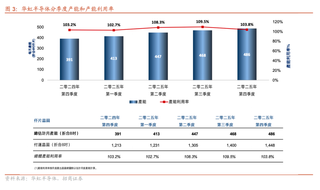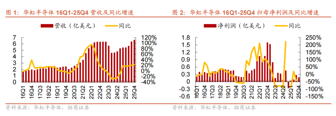 1)财务:25Q4收入6.599亿美元,再创历史新高,同比 22.4%/环比 3.9%,接近指引上限(6.5-6.6亿美元),主要系出货量增加及ASP上涨。毛利率13.0%,同比 1.6pcts/环比-0.5pct,符合此前指引(12%-14%),同比上升主要受益于ASP提升及降本增效,环比下降主要系人工开支上升。归母净利润1745.4万美元,同比-169.3%/环比-32.2%。2)产能、产能利用率及ASP:截至25Q4末折合8英寸产能为48.6万片/月,环比提升1.8万片/月;产能利用率103.8%,环比-5.7pcts,环比下降主要系FAB9爬坡;折合8英寸晶圆出货量为144.8万片,同比 19.4%/环比 3.4%;ASP为438.1美元/片(折合8英寸),环比 0.4%。