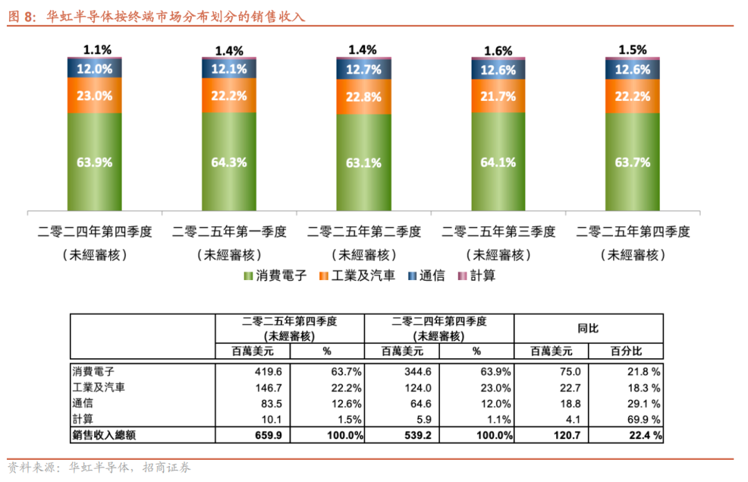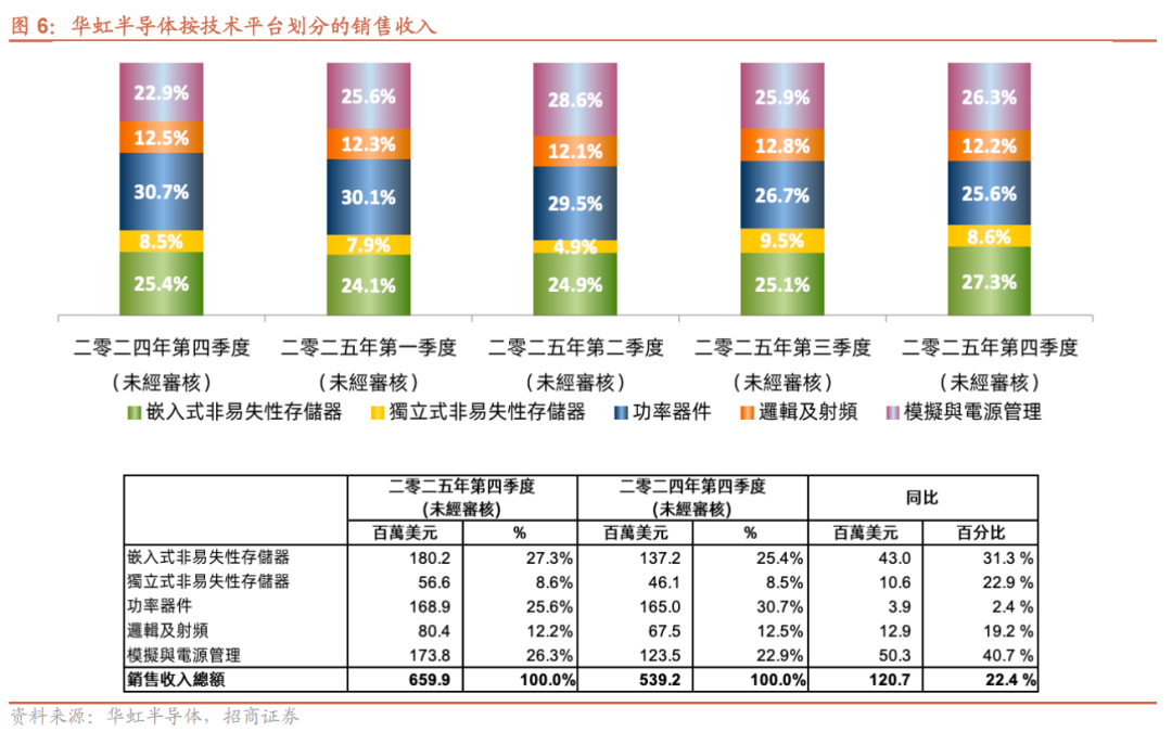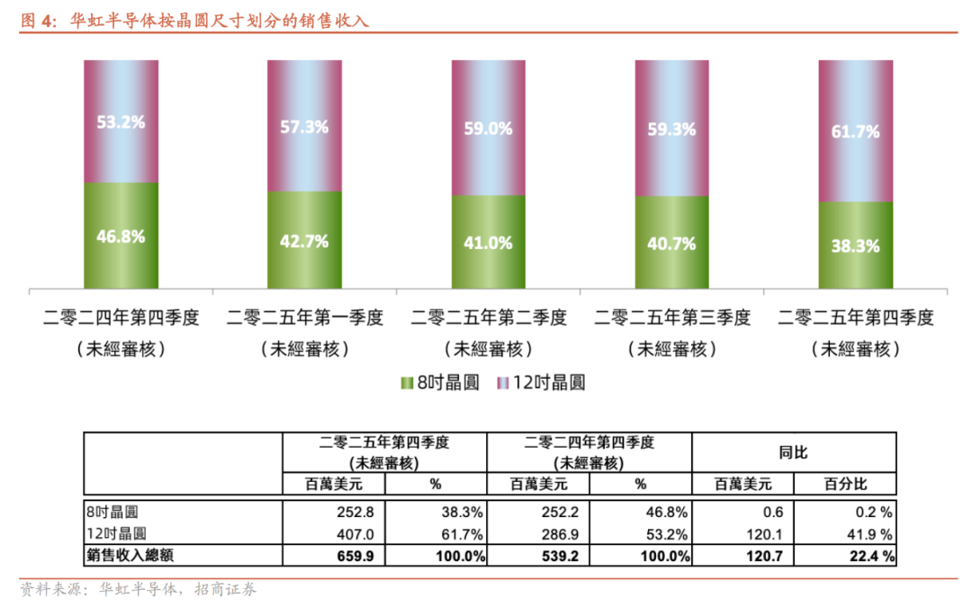 1)按技术平台划分:①嵌入式非易失存储平台:25Q4收入1.802亿美元,同比 31.3%/环比 12.9%,主要系MCU、车规级集成电路需求增加;②独立式非易失存储平台:营收0.566亿美元,同比 22.9%/环比-6.6%,得益于闪存产品需求增加,未来DRAM领域短缺态势可能会向NOR闪存传导;③功率器件:收入1.689亿美元,同比 2.4%/环比-0.1%,受通用MOSFET产品驱动;④逻辑与射频:收入0.804亿美元,同比 19.2%/环比-0.9%;⑤模拟与电源管理IC:收入1.738亿美元,同比 40.7%/环比 3.9%,延续三季度强劲增长,主要受益于电源管理产品需求增加。2)按晶圆尺寸划分:25Q4 8英寸晶圆营收2.53亿美元,占比38.3%,同比 0.2%/环比-2.3%;12英寸晶圆营收4.07亿美元,占比61.7%,同比 41.8%/环比 8.14%。