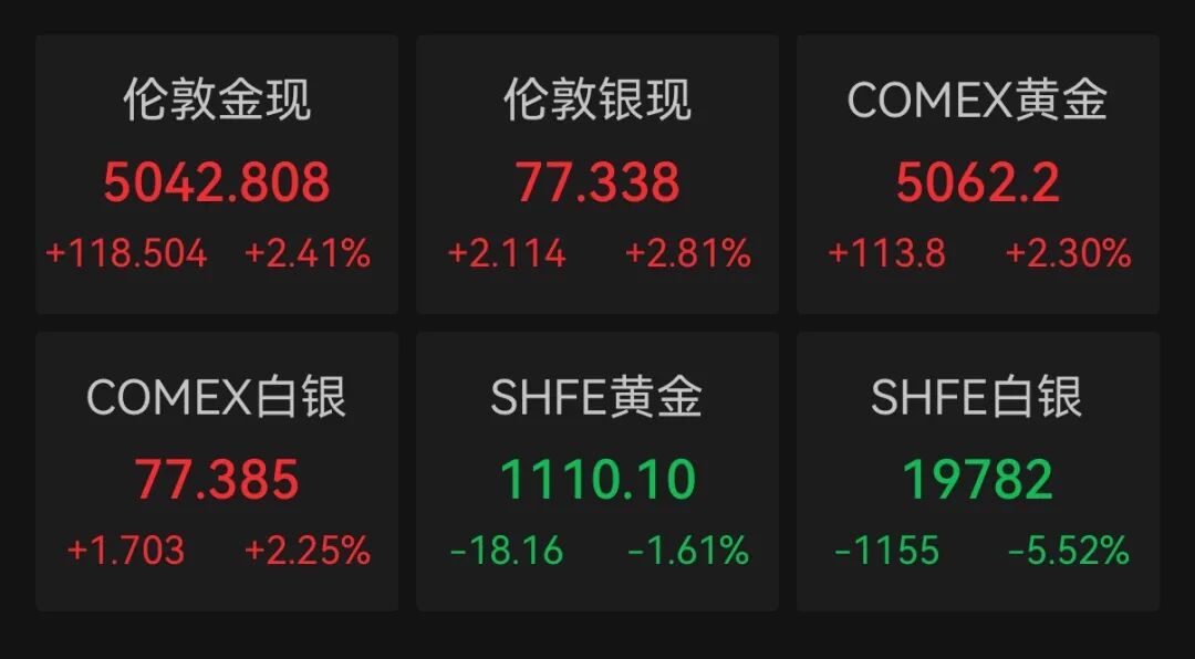 降息预期升温叠加避险需求回升,推动贵金属价格走高。截至北京时间6:03,伦敦金现货价格涨2.41%,报5042.808美元/盎司,盘中最高报5046.261美元/盎司;COMEX黄金期货价格涨2.3%,报5062.2美元/盎司,盘中最高报5069.1美元/盎司;伦敦银现货价格涨2.81%,报77.338美元/盎司,盘中最高报79.339美元/盎司,COMEX白银期货价格上涨2.25%,报77.385美元/盎司,盘中最高报79.265美元/盎司。国际油价微涨。据新华社报道,截至当地时间2月13日收盘,纽约商品交易所3月交货的轻质原油期货价格上涨5美分,收于每桶62.89美元,涨幅为0.08%;4月交货的伦敦布伦特原油期货价格上涨23美分,收于每桶67.75美元,涨幅为0.34%。