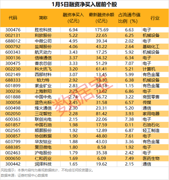 具体到个股,1月5日获融资净买入在1亿元以上的有63股,其中,17股融资净买入额均超2亿元。