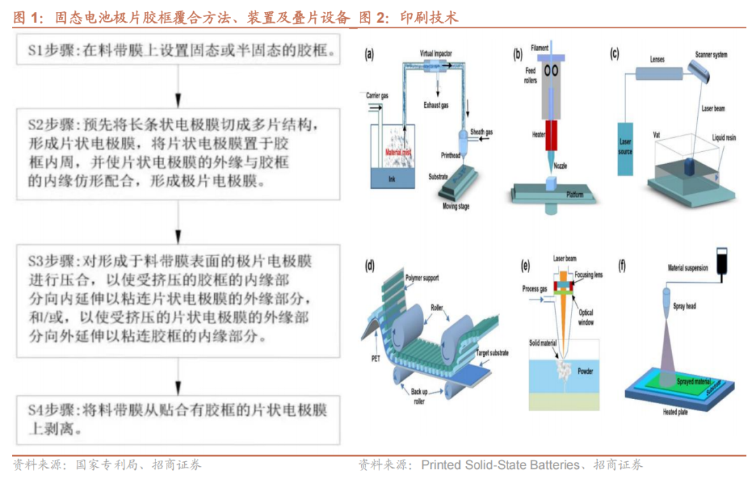 固态电池UV打印工艺介绍。全固态电池制造中,通过叠片工艺层叠正极、固体电解质、负极并通过等静压工艺确保界面接触。但高压易导致极片边缘塌陷或错位,引发正负极短路风险。为此需对极片绝缘封装,增设胶框隔离。胶框印刷技术中,UV打印凭借激光辅助的高精度(微米级)和自动化优势,较为适配固态电池制造需求,目前为头部电池厂的主要选择。
