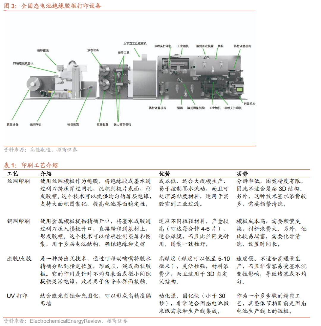 UV打印为胶框印刷方式的一种,胶框印刷主要分为丝网/钢网印刷、UV打印、涂胶/点胶等相比,其中UV打印强调激光辅助的高精度和自动化,常与3D打印技术结合,实现微米级控制,较为适配固态电池独特的制造需求。