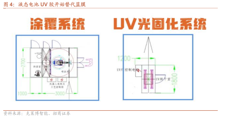 此外该工艺对UV绝缘胶本身也带来了更高的性能要求。传统液态电池中,UV胶的喷涂主要用在替代传统蓝膜方案,在锂离子电池表面形成一层坚固、透明的保护膜(传统方案为蓝色,俗称蓝膜)。UV材料具备几个优点:1、保性能卓越,UV喷涂材料无毒无害,符合环保要求,有效降低生产过程中的环境污染。2、生产效率高,可在短时间内完成涂覆,大幅提高生产效率。3、耐高压。绝缘耐压性能优;附着力好,抗拉强度好;耐磨性好。