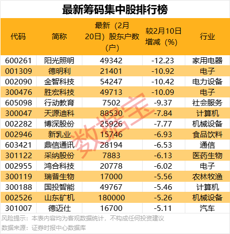 股东户数降幅最多的是阳光照明,截至2月20日最新股东户数为49342户,较2月10日下降12.23%;德明利、金智科技、胜宏科技等股东户数降幅也超一成。