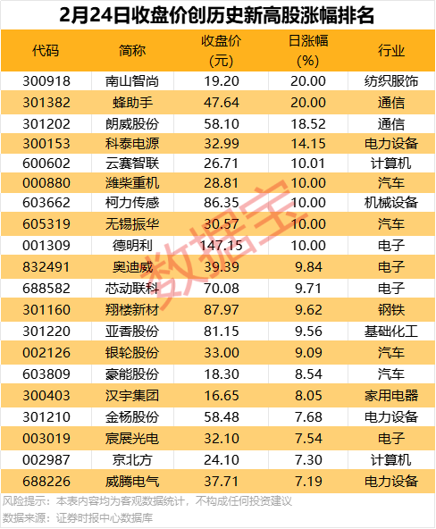 从股价表现看,收盘创历史新高股中,今日股价平均上涨5.60%,涨停的有南山智尚、蜂助手、云赛智联等,涨幅居前的有朗威股份、科泰电源、奥迪威等。