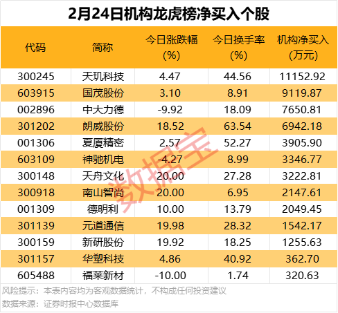 2月24日龙虎榜中,共13股获机构净买入,天玑科技获机构净买入1.12亿元,净买入金额居首,国茂股份、中大力德、朗威股份机构净买入金额均超5000万元。