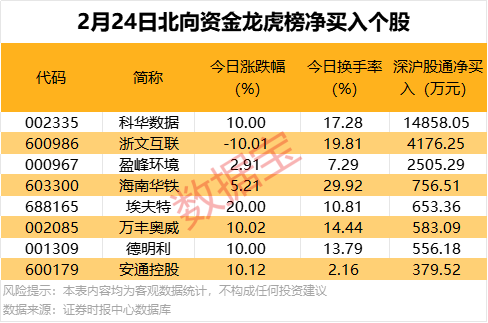 北向资金今日龙虎榜净买入最多的是科华数据,净买入1.49亿元,浙文互联、盈峰环境北向资金净买入也均超2000万元。