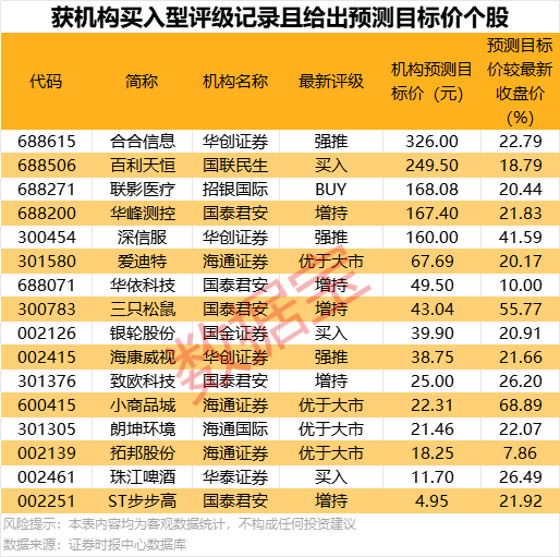 获机构买入型评级个股中,共有16条评级记录中对相关个股给出了未来目标价。以公布的预测目标价与最新收盘价进行对比显示,共有13股上涨空间超20%,小商品城预计上涨空间最高,2月24日海通证券预计公司目标价为22.31元,上涨空间达68.89%,上涨空间较高的个股还有三只松鼠、深信服等,上涨空间分别为55.77%、41.59%。