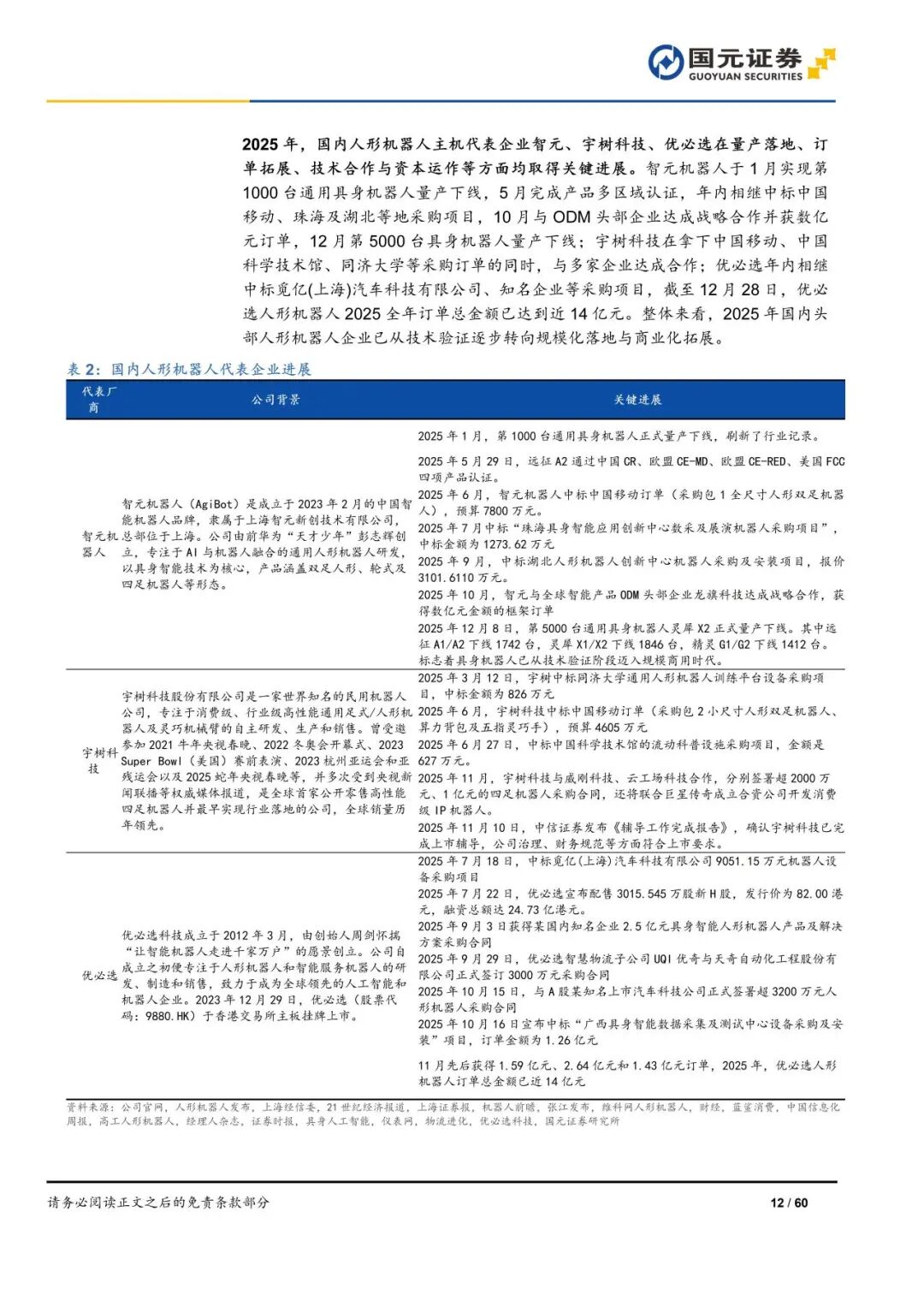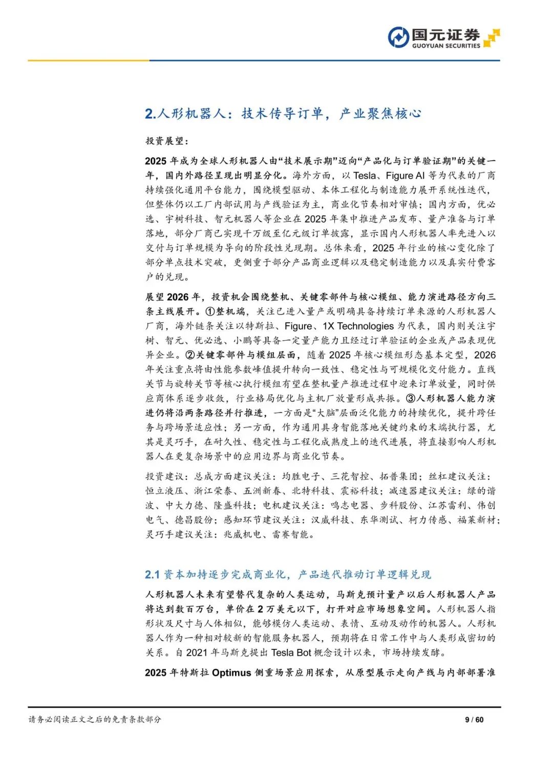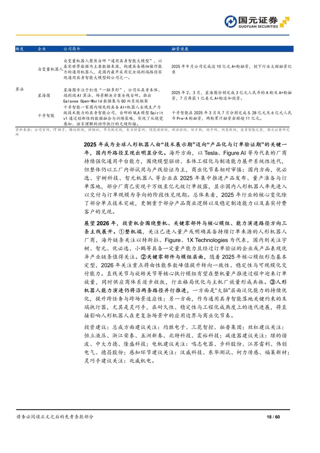 展望2026年,投资机会围绕整机、关键零部件与核心模组、能力演进路径方向三条主线展开。①整机端,关注已进入量产或明确具备持续订单来源的人形机器人厂商,海外以特斯拉、Figure、1X Technologies为代表,国内关注宇树、智元、优必选、小鹏等具备一定量产能力且经过订单验证的企业或产品表现优异企业。②零部件层面, 2025年核心模组形态基本定型,2026年直线关节与旋转关节等核心执行模组有望在整机量产推进过程中迎来订单放量,同时供应商体系逐步收敛,行业格局优化与主机厂放量形成共振。③人形机器人能力演进将沿两条路径并行推进,一方面是“大脑”层面泛化能力的持续优化,提升跨任务与跨场景适应性;另一方面作为通用具身智能落地关键约束的末端执行器,在耐久性、稳定性与工程化成熟度上的迭代进展,将直接影响人形机器人在更复杂场景中的应用边界与商业化节奏。