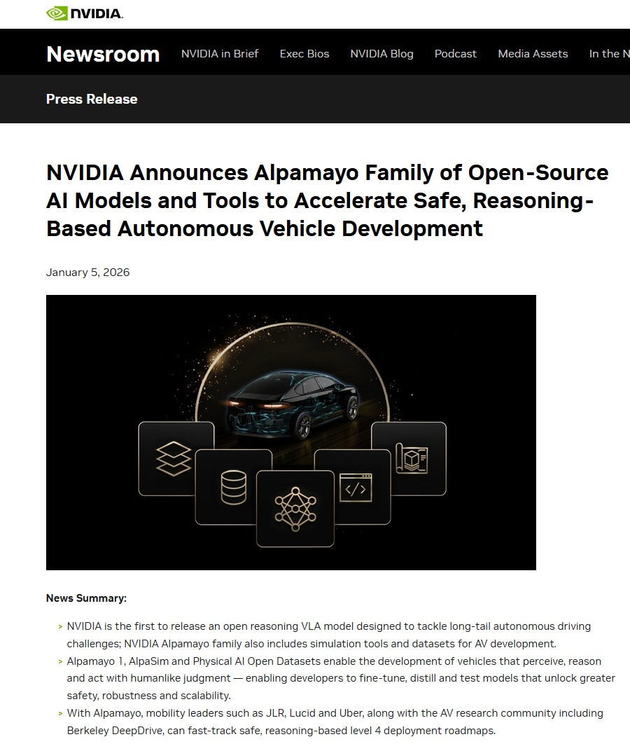 英伟达表示,包括 Lucid、捷豹路虎、Uber和Berkeley DeepDrive等车企,都对Alpamayo表现出兴趣,希望开发基于推理的自动驾驶堆栈,以实现L4级自动驾驶。