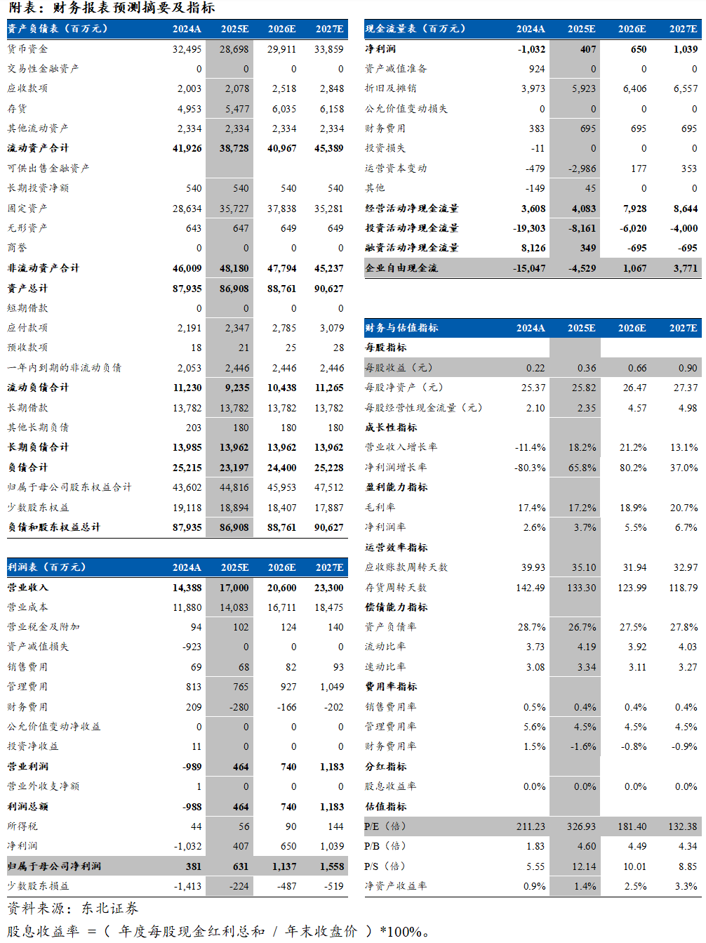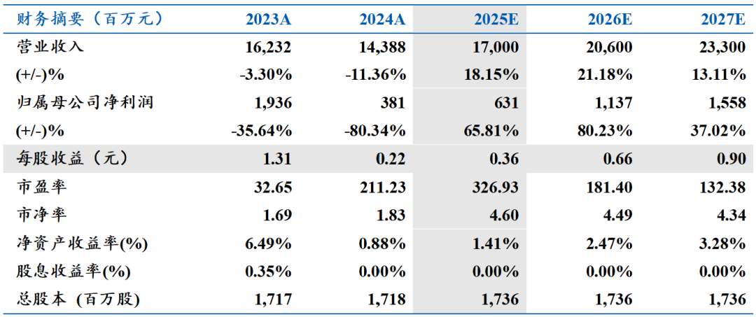 盈利预测与投资建议:我们预计公司2025-2027年营业收入分别为170.00/206.00/233.00亿元,归母净利润分别为6.31/11.37/15.58亿元,对应PE分别为326.93x/181.40x/132.38x。首次覆盖,给予“买入”评级。