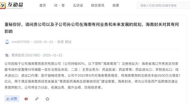 鹭燕医药2025年12月23日在深交所的互动易上表示,公司于2023年9月对海南鹭燕(控股子公司)增资,将海南鹭燕的注册资本由3500万元增至1亿元,用于满足海南鹭燕经营发展及“鹭燕医药海南总部基地项目”建设需要。海南封关,将为公司医药产品跨境流通业务提供助力。公司将全力以赴,拓展业务,提升业绩,回报投资者。