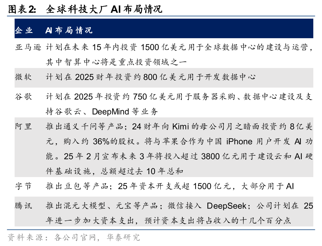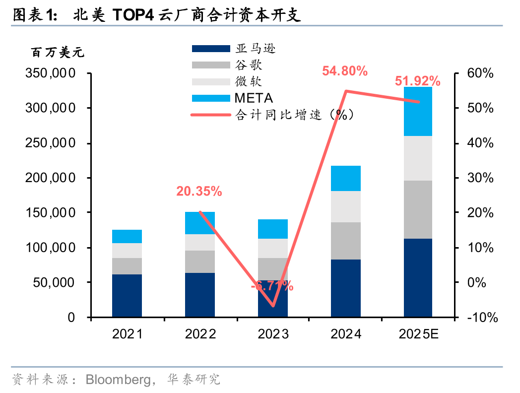 AI技术快速发展的背景下全球算力需求持续提升,以科技巨头为代表的企业正加大数据中心的投资力度。今年以来欧美多次发声加码AI投资,1月21日,美国总统宣布OpenAI、软银和甲骨文将共同投资建设的AI基础设施项目“星际之门”,计划在未来4年内投资5000亿美元。2月11日,欧盟委员会主席宣布欧盟在未来几年内将调动2000亿欧元用于AI投资。根据Bloomberg一致预期(8月1日),2025年北美TOP4云厂商(亚马逊、微软、谷歌、META)合计资本开支将达3301亿美元,同比增长52%。