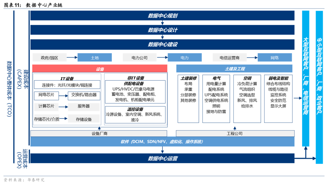 数据中心设备包括IT设备、非IT设备。数据中心按生命周期可以分为规划、设计、建设、运营四大阶段,其中建设阶段是数据中心从概念走向实体的关键环节,包括用地、用电、用水、用网、IT设备、土建及其他工程、软件系统等。设备可以分为IT设备、非IT设备(供配电设备、温控设备等)。数据中心的下游应用主体包括互联网企业、云厂商、金融机构、基础运营商等。