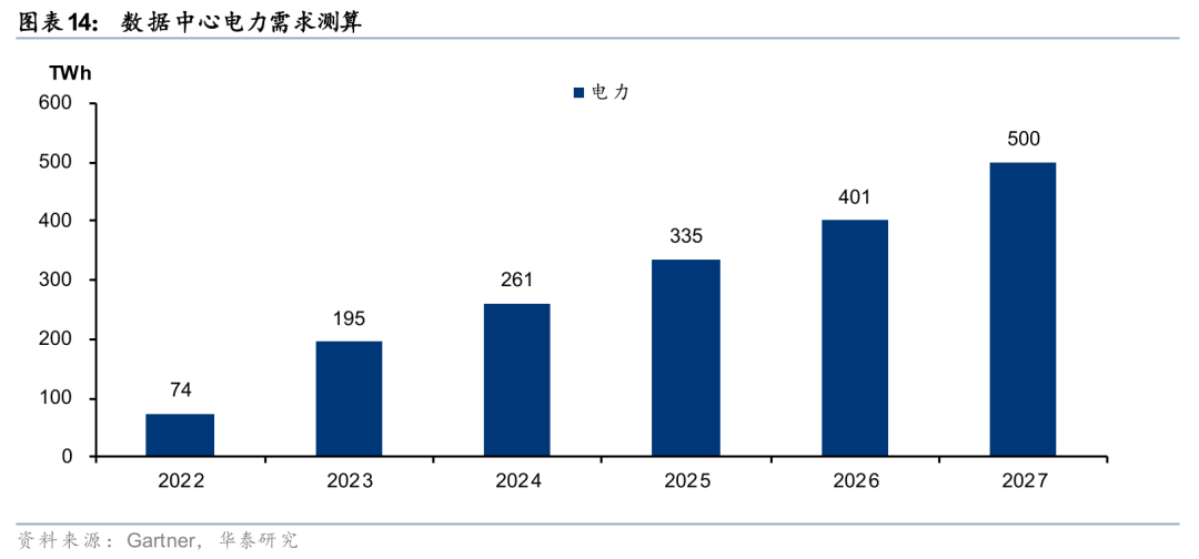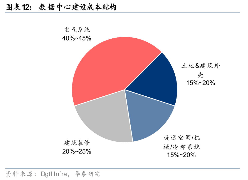 数据中心建设成本中电气系统占比约40%~45%,运营成本中电费占比约50%,数据中心扩建带来电力相关需求高增。据Dgtl Infra,数据中心建设成本中电气系统占比最高,达40%~45%,包括柴油发电机组、PDU、UPS电源、开关设备/变压器等。运营成本方面,据安永统计,电费约占运营成本的50%。据Gartner,AI的快速发展正推动电力消费急剧增长,预计到2027年,数据中心运行增量AI优化服务器所需的电力将达到每年500 TWh,为2023年的2.6倍。