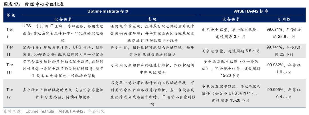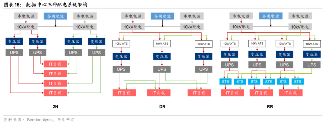 AI训练场景对于供电的连续性、效率、冗余要求提高。依据可用性与设备冗余程度,国际较为通用的分级标准包括Uptime Institute与ANSI/TIA-942。为保证数据中心连续运行,电源设备需要备用冗余配备,常见“N 1”“2N”等方案;可用性(Availability)指设备预期不停机时间占比。三级数据中心是全球大型设施中最常见的数据中心,通常需要变压器和发电机等 N 1 冗余,以及配电组件(UPS和PDU)的2N冗余。过往四级数据中心不太常见,必须具有“容错能力”,通常用于政府关键数据中心设施等。AI训练场景下对供电连续性要求提高,对冗余设计要求或进一步提高。