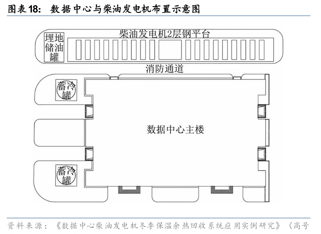 柴油发电机组为数据中心灾备电源的首选方案,在数据中心中成本占比约10%。数据中心通常从公用电网获取高压电力,然后将低压电力分配给 IT 设备。由于电网存在故障等情况可能会导致断电,备用柴油发电机组在主电源中断期间的供电中起着重要作用。柴油发电机组的原理是通过发动机燃烧柴油将热能转化为机械能,再通过发电机将机械能转化为电能。柴油发电机组的成本在数据中心总成本的占比约10%。