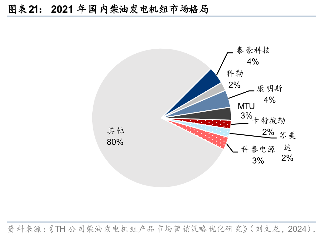 国内柴油发电机组行业呈现“外资主导高端、国产抢占中高端”的梯队结构。国内市场柴油发电机组企业可以分为三个梯队,第一梯队为以MTU、卡特彼勒、康明斯、科勒等为代表的外资品牌,掌握柴油发动机核心技术,主导高端市场;第二梯队为以潍柴、玉柴、泰豪科技、科泰电源、苏美达等为代表的国产原装与OEM厂商,一般采用进口或国产知名品牌的发动机和发电机,抢占中高端市场;第三梯队为以“扬泰系”和“福安系”为代表的国产企业,一般采用本土发动机和发电机,市场较为分散,主要面向低端民用市场。
