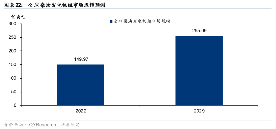 全球柴油发电机组市场规模超千亿人民币,2023年数据中心下游占比约15%。据QYResearch,2022年全球柴油发电机组市场规模约为149.97亿美元,预计2029年将达到255.09亿美元,复合增速为7.46%。其中,2022年中国、美国占比分别为27.86%、19.88%。据QYResearch,2023年全球数据中心用柴油发电机组市场销售额达24.13亿美元,测算其在整体柴油发电机组市场占比约15%。